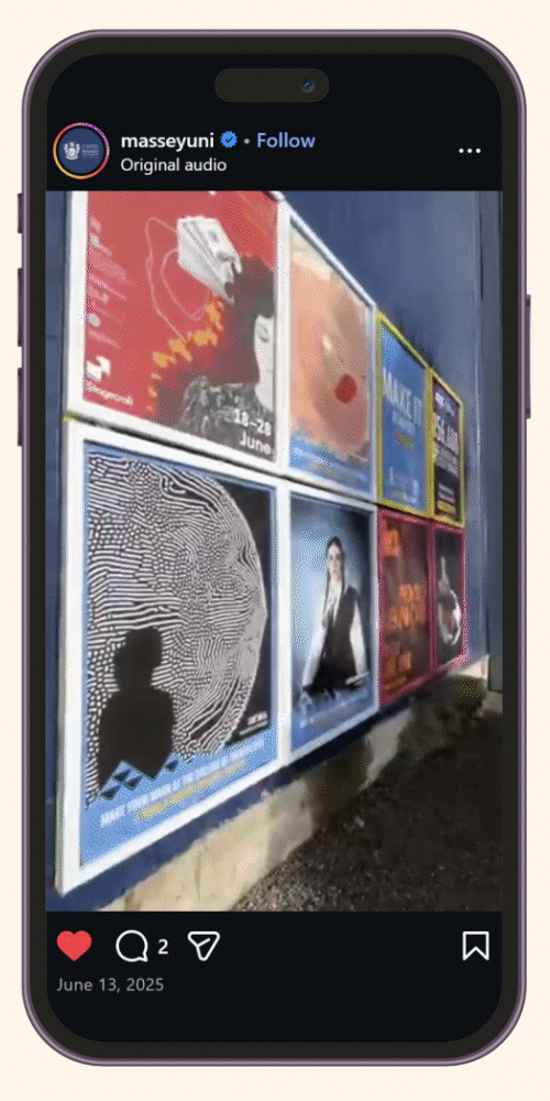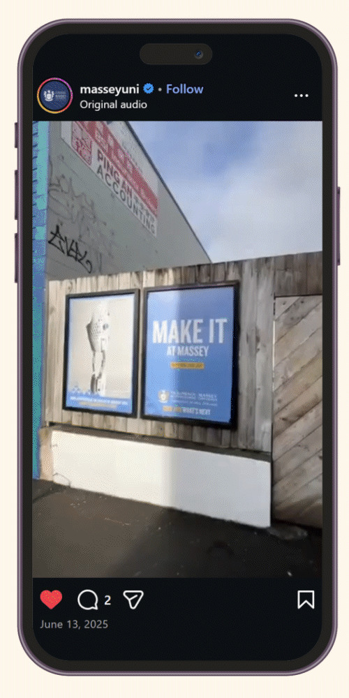 A full circle moment. After studying my Bachelors at Massey, I found it quite fun to be on the opposite side. Once their student, now their promoter. Working on social ads, designing graphics that pushed the guidelines and being reminded of the sheer amount of courses that Massey provides it’s students.
